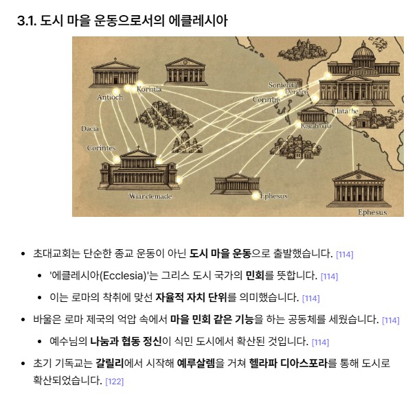 바울이 빌립보, 데살로니가, 고린도 같은 도시에서 세운 에클레시아는 로마의 억압 속에서 '마을 민회'처럼 기능했어요 . 예수님의 갈릴리 마을 공동체 정신이 로마의 식민 도시에서 '도시 마을 공동체'로 확산된 것이랍니다 . 바울은 율법이나 할례 같은 장벽을 허물고, 인종, 계급, 성별 차별을 무너뜨리는 혁명적인 공동체(갈라디아 모델)를 만들었어요 .
