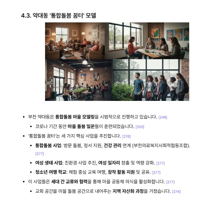 예를 들어 부천의 약대동에서는 '통합돌봄 꿈터'를 운영할 비전을 가지고 있어요 . 이곳에서는 방문 돌봄, 정서 지원, 생활 지원 같은 '통합돌봄 사업'을 부천의료복지사회적협동조합과 연계하여 제공할 예정이죠 . 또한 친환경 패션이나 요리 같은 '여성 생태 사업'으로 일자리를 만들고 , 청소년들이 여행과 창작 활동을 하는 '청소년 여행 학교'를 운영하여 세대 간 교류를 활성화하려고 한답니다 . 무너진 마을을 되살리는 'K-예수 마을 교회'는 이렇게 지역에 뿌리내린 '마을 신자'와 책임감 있는 '시민-신자'를 키워내는 곳이 될 거예요 .