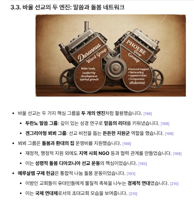 바울의 선교에는 두 개의 엔진이 있었어요. 하나는 '두란노 말씀 그룹'이에요. 이곳에서는 깊이 있는 성경 연구로 믿음의 리더를 키웠어요 . 다른 하나는 '뵈비 그룹'이죠. 이들은 선교 비전을 듣고 재정적, 행정적 지원을 했어요 . 이 두 그룹 덕분에 말씀과 돌봄 네트워크가 함께 작동할 수 있었고, 선교 운동의 핵심이 되었답니다 . 나아가, 이방인 교회들은 예루살렘 교회를 위해 헌금을 모았어요 . 이것은 유대인과 이방인이 물질적 축복을 나누는 국제적인 연대체였죠 .