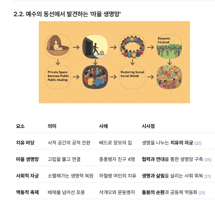 예수님의 치유 사역은 단지 병을 고치는 것 이상이었어요 . 당시 나병이나 혈루증 같은 병은 몸이 아픈 것을 넘어, 그 사람이 공동체에서 완전히 쫓겨나는 '사회적 사망'을 의미했거든요 . 문둥병자에게 손을 내민 것은 고립된 사람을 다시 관계망 안으로 불러들여 생명망을 짜는 하나님 나라 운동이었죠 . 예수님의 이런 사역은 무너진 '사회적 관계망', 즉 '생명망'을 복원한 행위였어요 . 이는 마치 버림받은 생명들을 다시 품어 새로운 삶을 키워내는 '사회적 자궁'을 창조하는 의미와 같아요 .