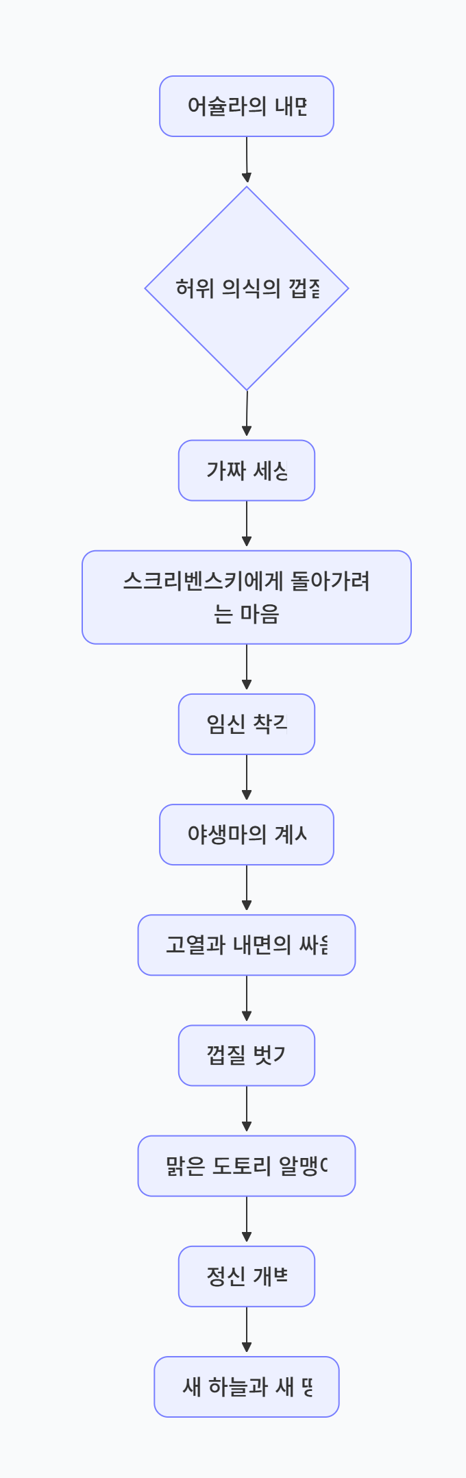 이후 어슐라는 고열에 시달리며 자신의 내면, 즉 허위 의식과 싸워요 . "왜 이 허위가 일이 오래 지속되는가? 왜 그녀는 미망에서 깨어나 선명한 현실을 직시하지 못하는가?" . 죽음과 정신 분열의 경계까지 갔던 어슐라는 마침내 이 시련을 이겨냅니다 . 허위 의식의 껍데기를 모두 벗어던지고 '맑간 도토리 알맹이'처럼 유일한 진실이 된 어슐라는 정신 개벽의 순간을 맞이하죠 . 백락청 선생님은 이 경지가 공자가 말한 '인(仁)'의 경지와 같다고 보셨어요 .